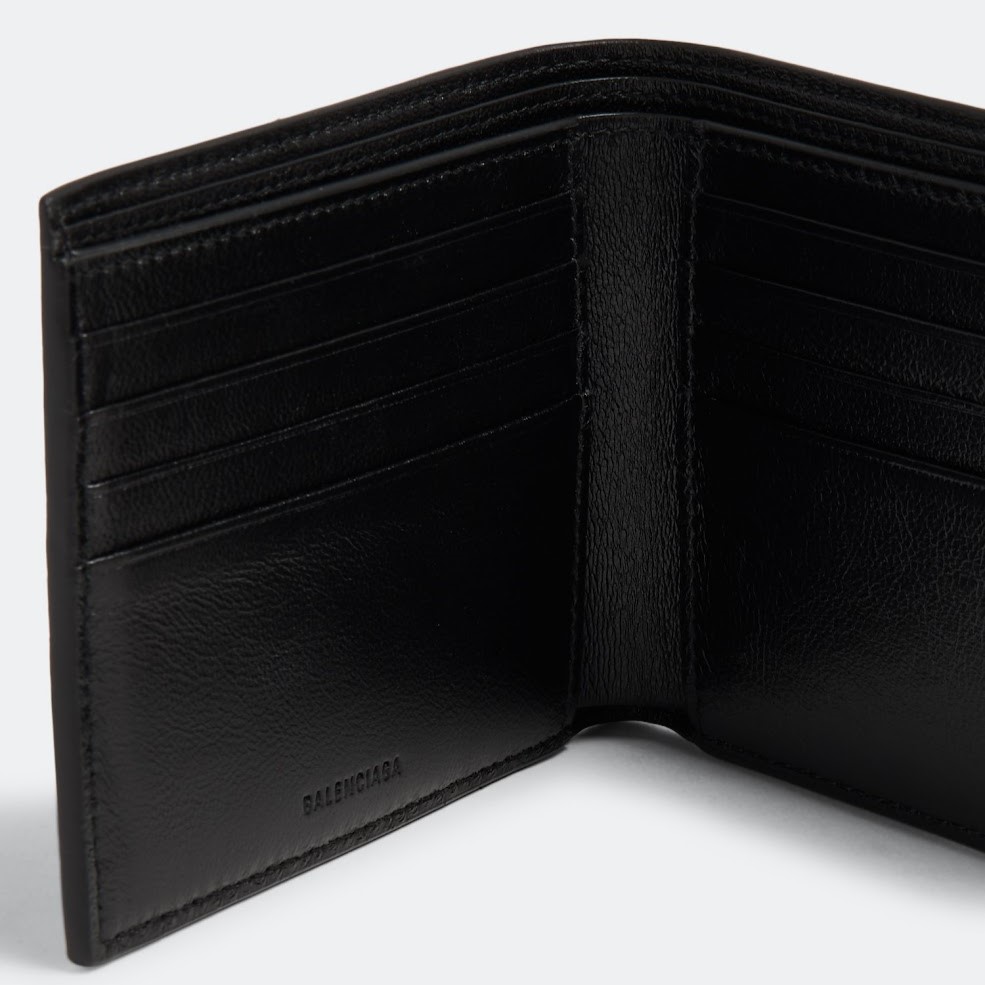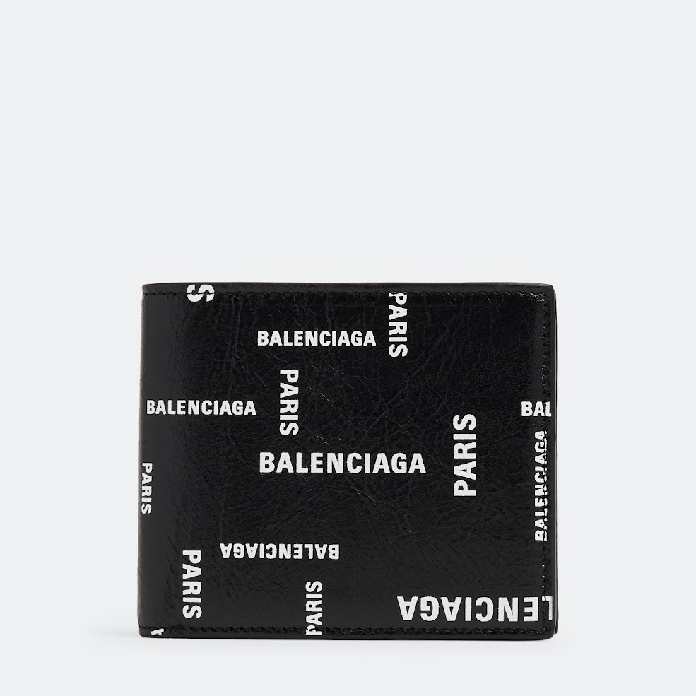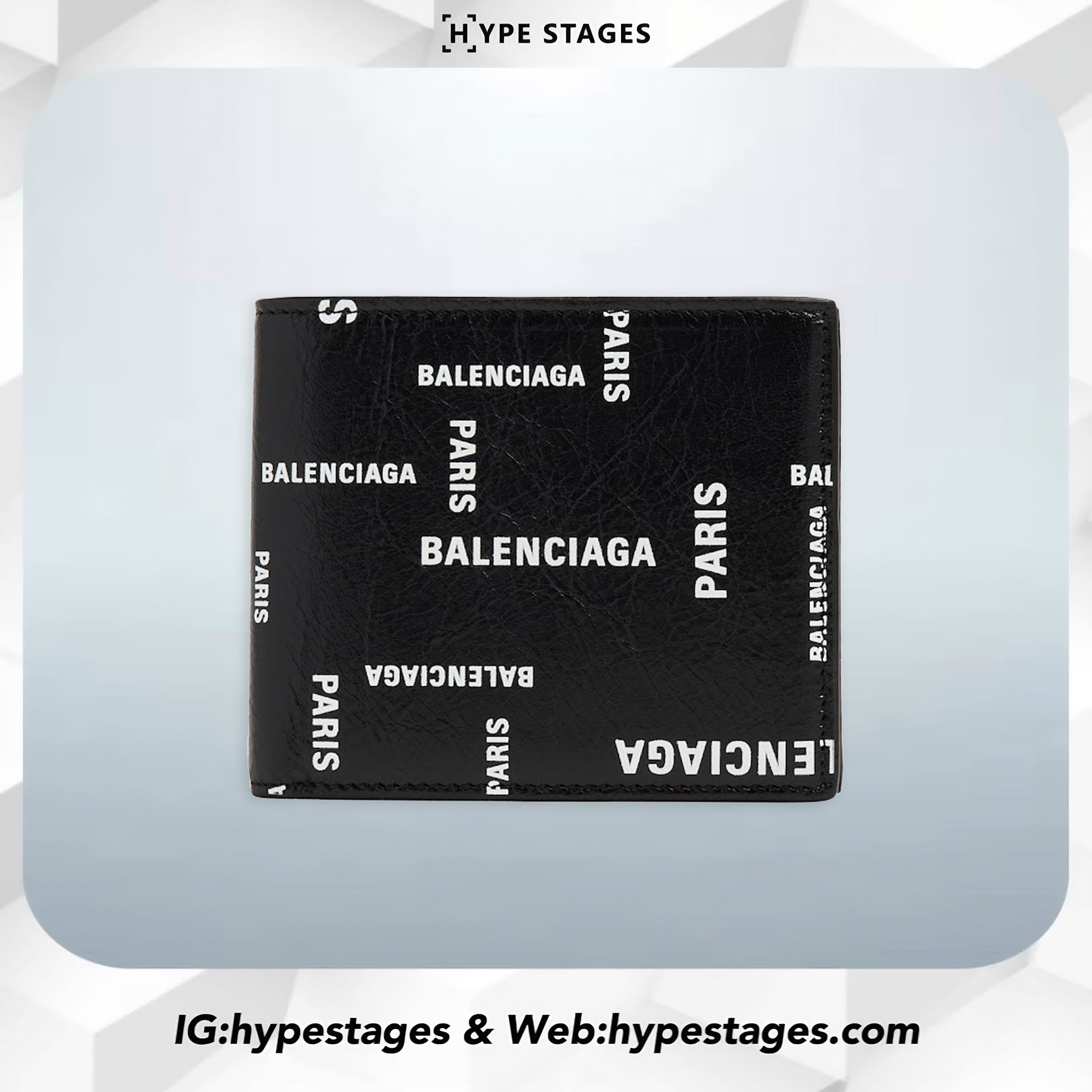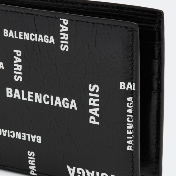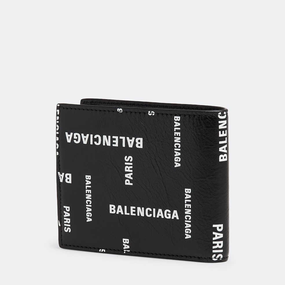The BALENCIAGA Logo Bifolded Wallet brings together classic form and bold branding. Made from black textured leather and finished with an all-over white BALENCIAGA and PARIS logo print, this compact bifold design offers function with fashion. Perfectly sized to fit in your pocket while holding essentials with refined edge.