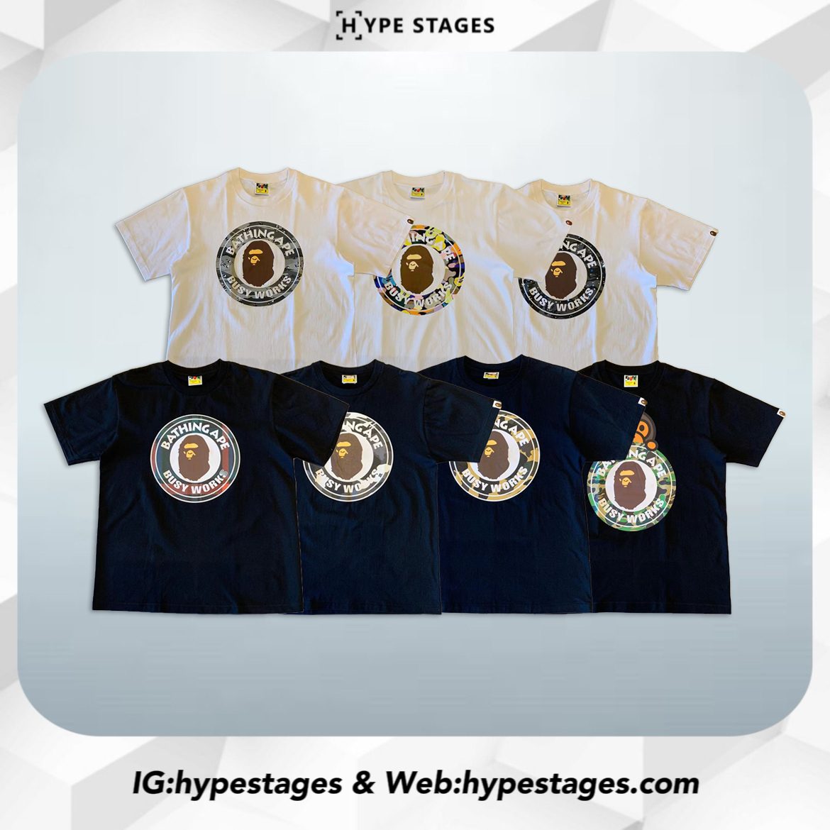 The BAPE Busy Work Tee highlights the brand’s heritage with a bold “Busy Works” emblem featuring the classic Ape Head logo at the center. With multiple camo patterns and colorways such as Space Camo and Multicolor Camo, this tee captures BAPE’s timeless blend of streetwear attitude and graphic design excellence.