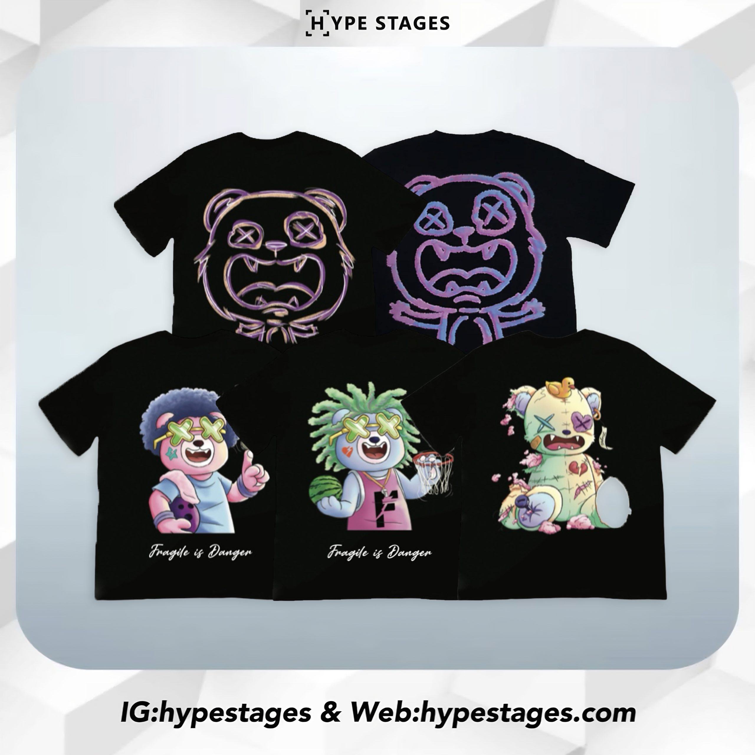 FRAGILE TEE Batch 3 returns with a colorful lineup of signature bear characters and surreal mascot graphics. Each tee features playful back prints like Dead Bear, Crayon Bear, Blue Basketball, and more. With a consistent FRAGILE chest logo and premium cotton base, this drop delivers fun and flair to your streetwear rotation.