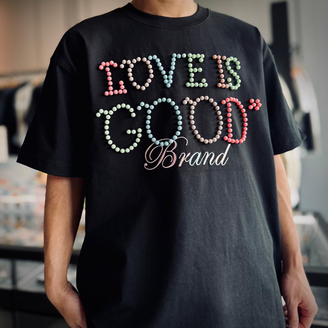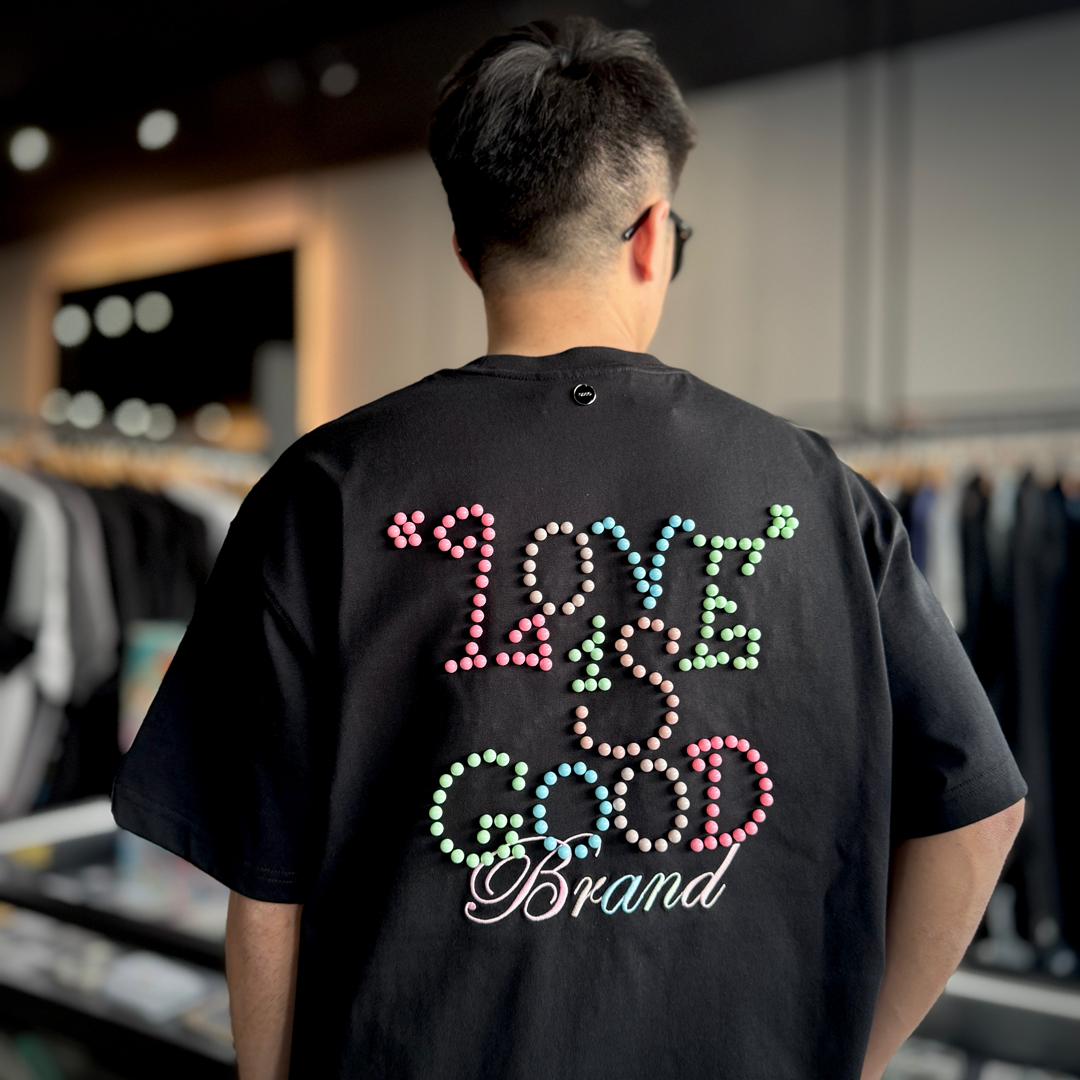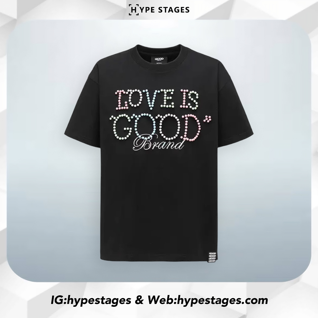 The GOODBRAND Macaroon Pearl Logo Tee is where playful meets premium. Featuring the signature “LOVE IS GOOD” slogan formed from pastel-tone pearl beads and delicate “Brand” embroidery, this tee captures both sweet charm and luxury street appeal. With a bold front-and-back design, it’s a standout piece for those who love soft color with strong identity.