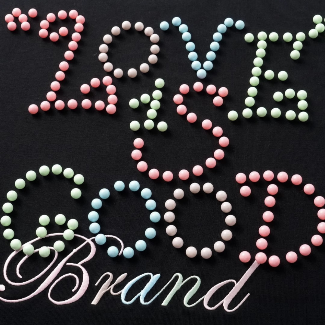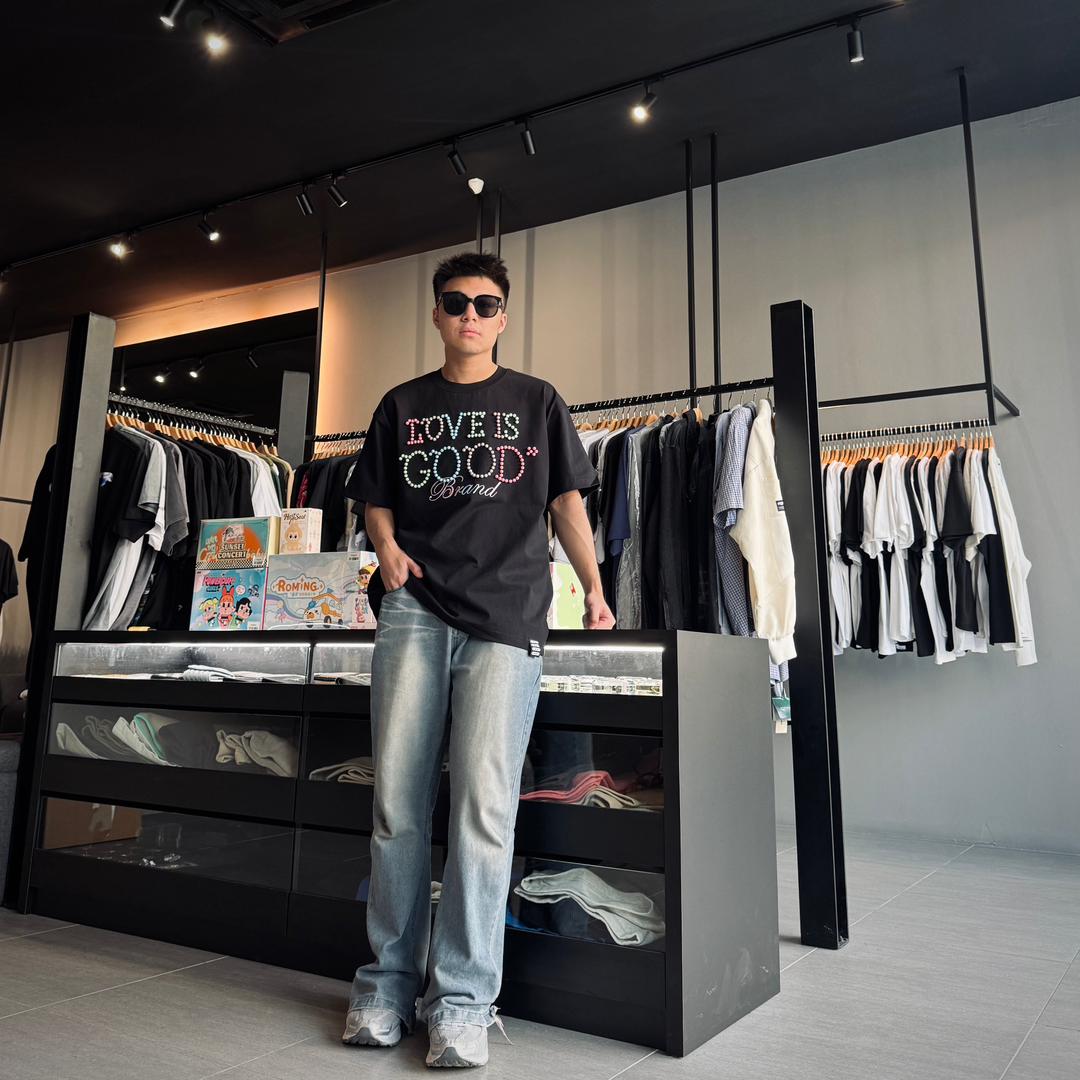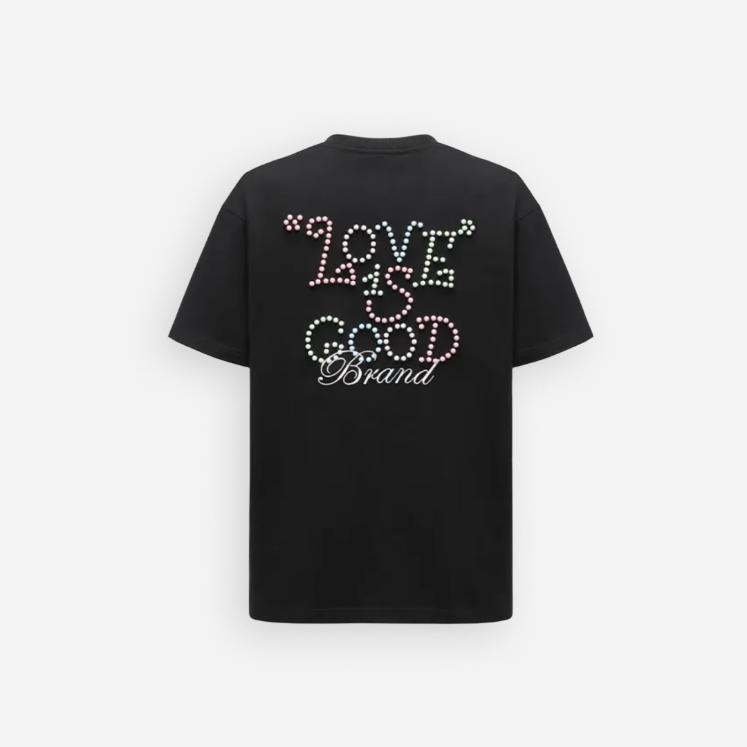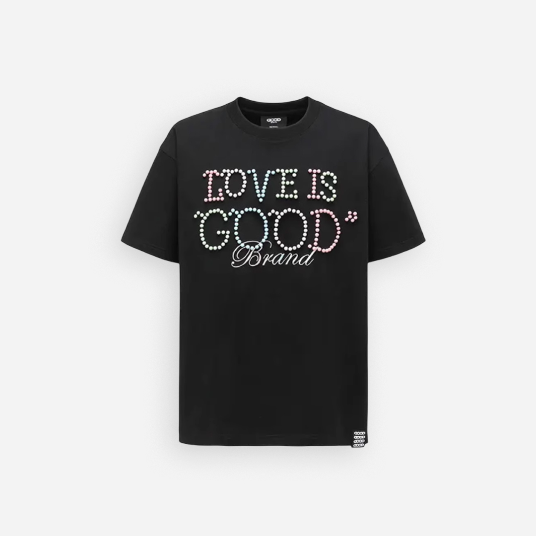 The GOODBRAND Macaroon Pearl Logo Tee is where playful meets premium. Featuring the signature “LOVE IS GOOD” slogan formed from pastel-tone pearl beads and delicate “Brand” embroidery, this tee captures both sweet charm and luxury street appeal. With a bold front-and-back design, it’s a standout piece for those who love soft color with strong identity.
