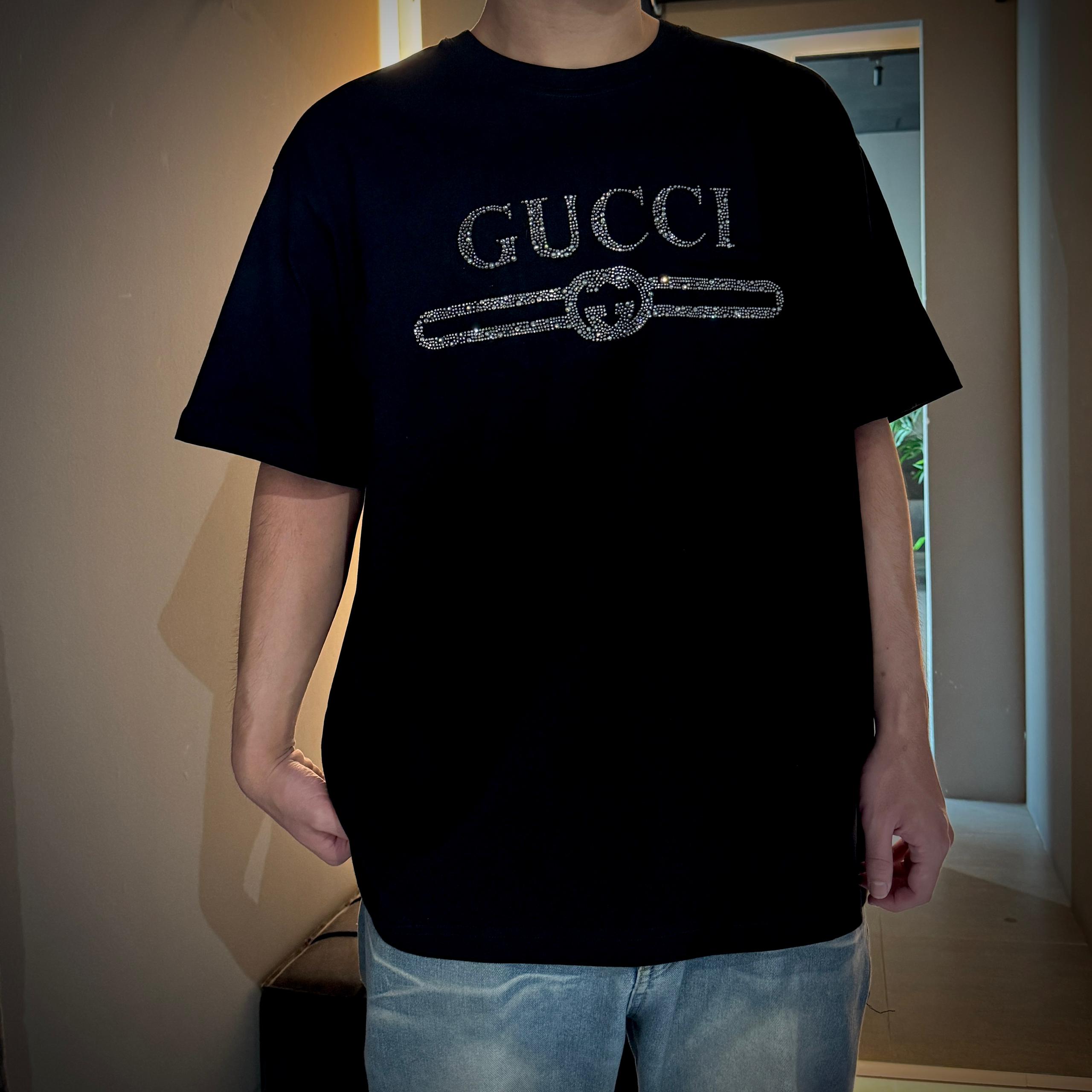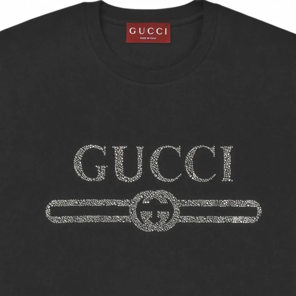 Elevate your wardrobe with the Gucci Rhinestone Classic Logo Tee – a refined fusion of timeless branding and dazzling embellishment. Crafted from premium cotton, this black tee features Gucci’s iconic logo rendered in shimmering rhinestones, delivering a luxurious edge to everyday streetwear.
