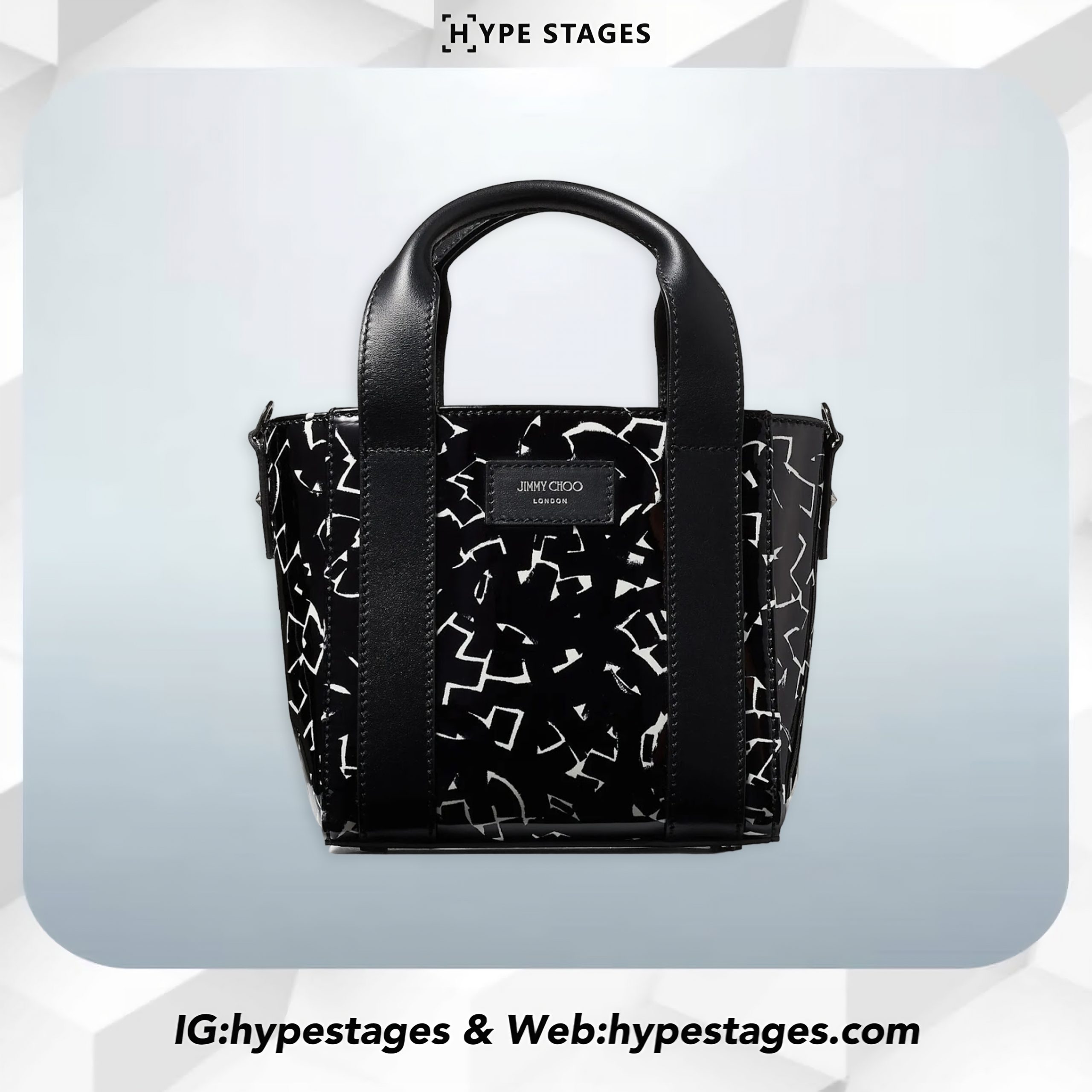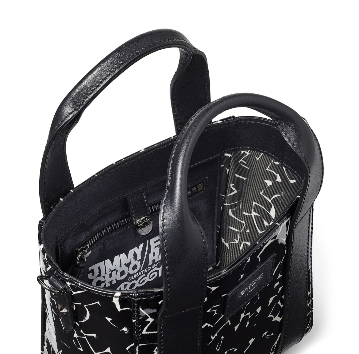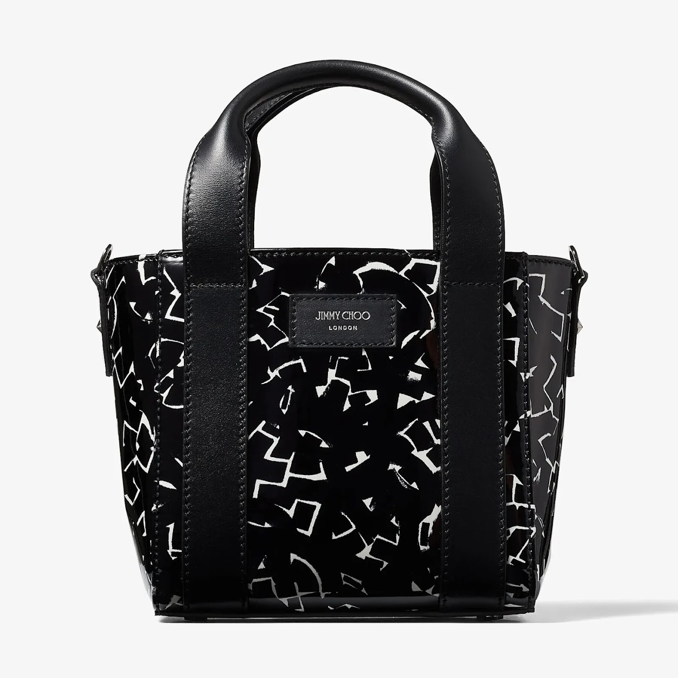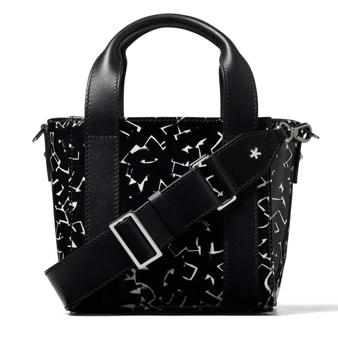 A bold collision of art and fashion, the JIMMY CHOO Artwork Patent Leather Tote Bag is designed in collaboration with NYC graffiti artist Eric Haze. Featuring glossy patent leather covered in abstract white artwork, this structured tote includes dual handles and a wide detachable strap for versatile styling. Perfect for turning heads in any city scene.
