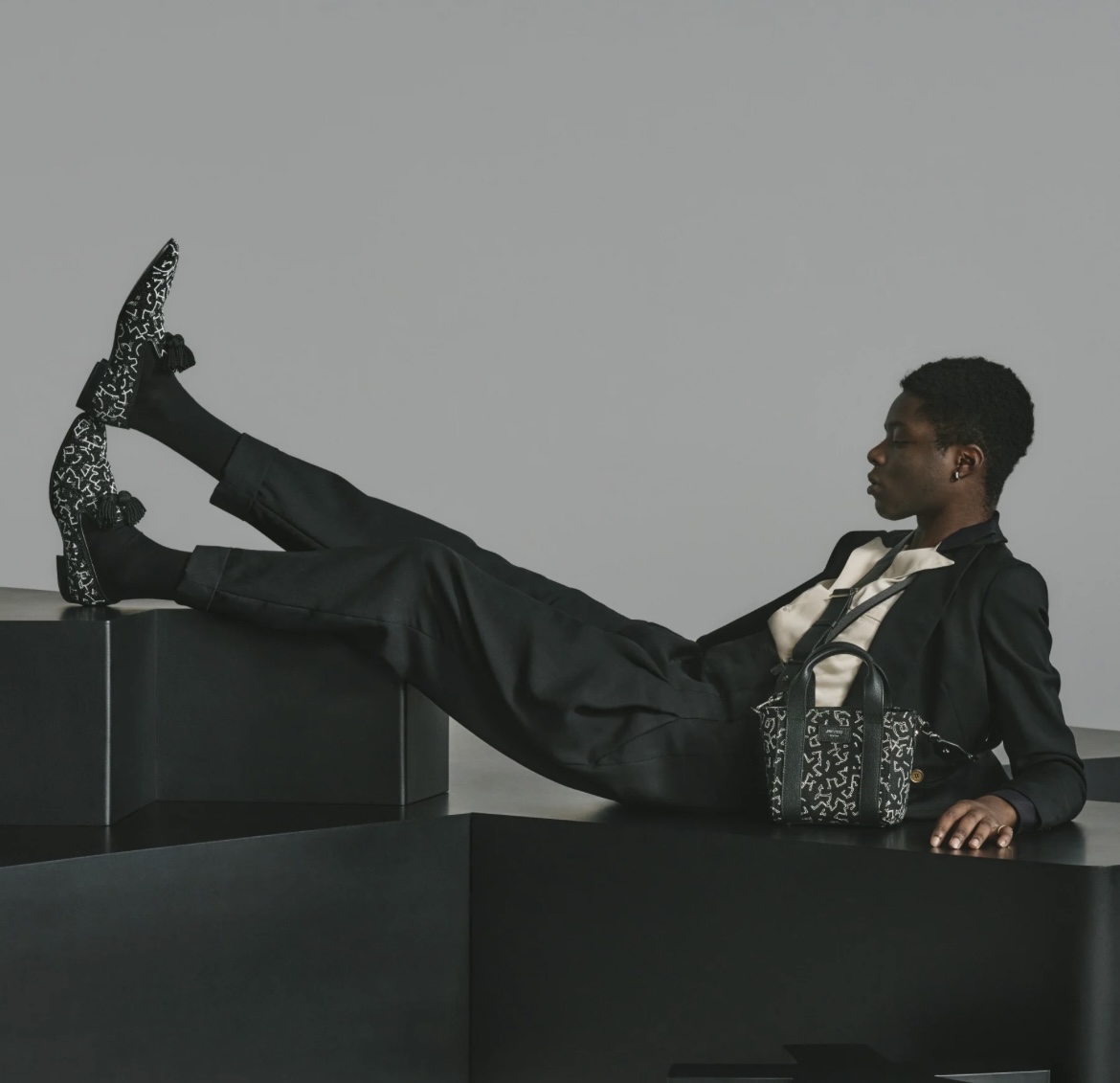 - Structured body with glossy black patent finish