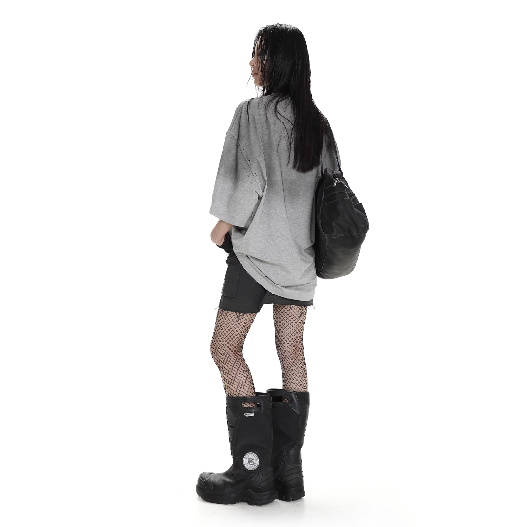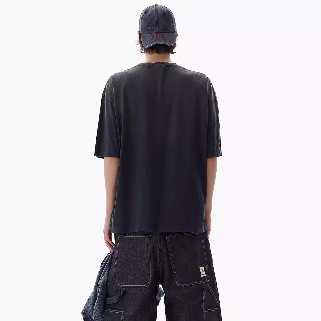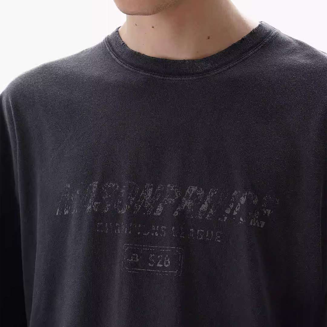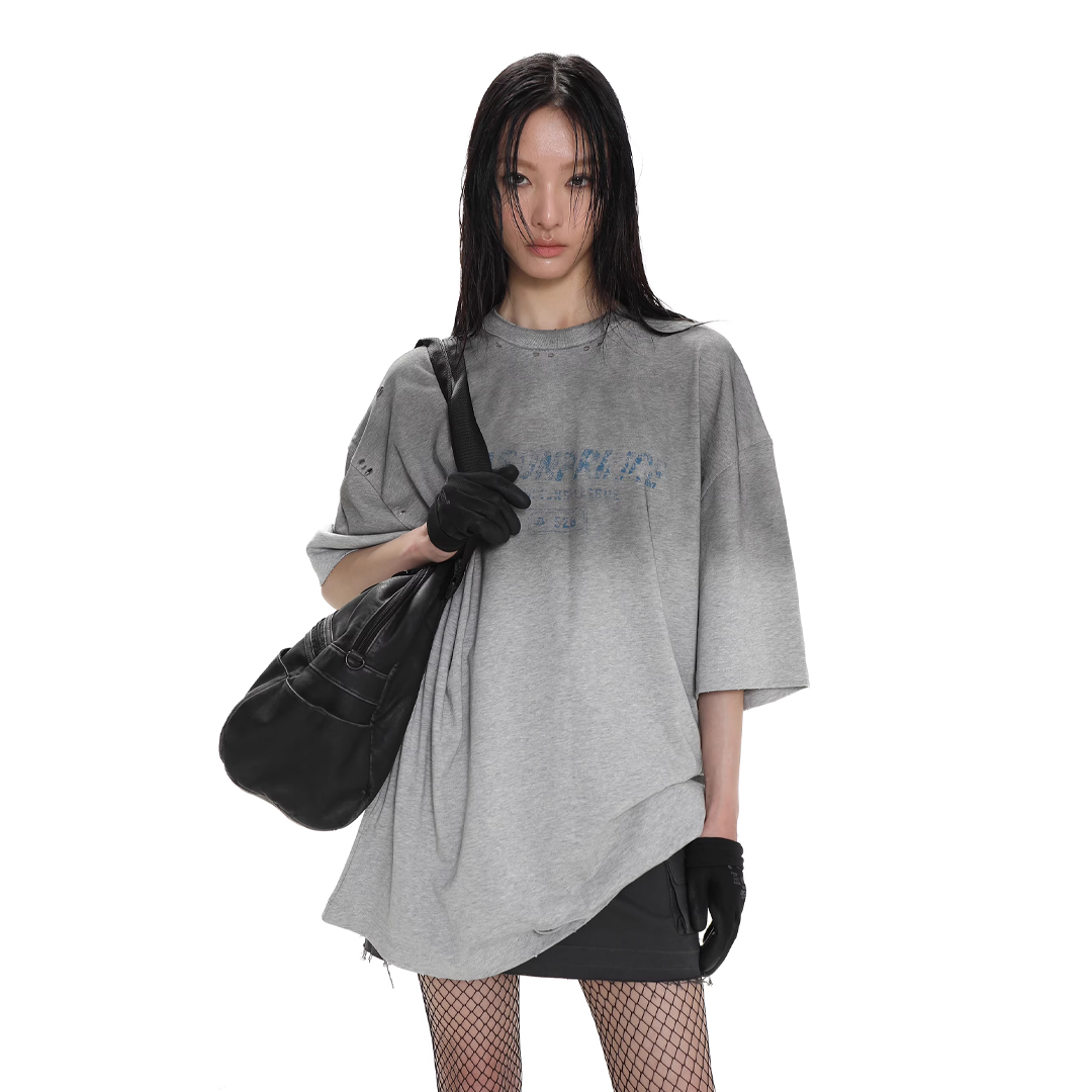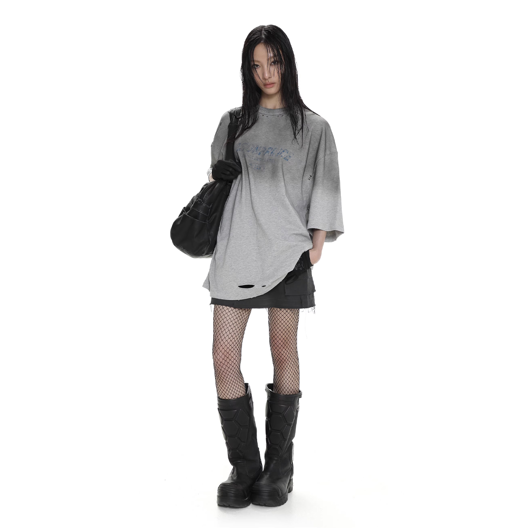 The MASONPRINCE Distressed Destroy Tee offers a rebellious yet effortless attitude with its deliberately aged print and raw-edge details. This oversized tee in faded grey features a collegiate-style graphic with a washed-out effect, enhanced with grunge-inspired distressing throughout the fabric.