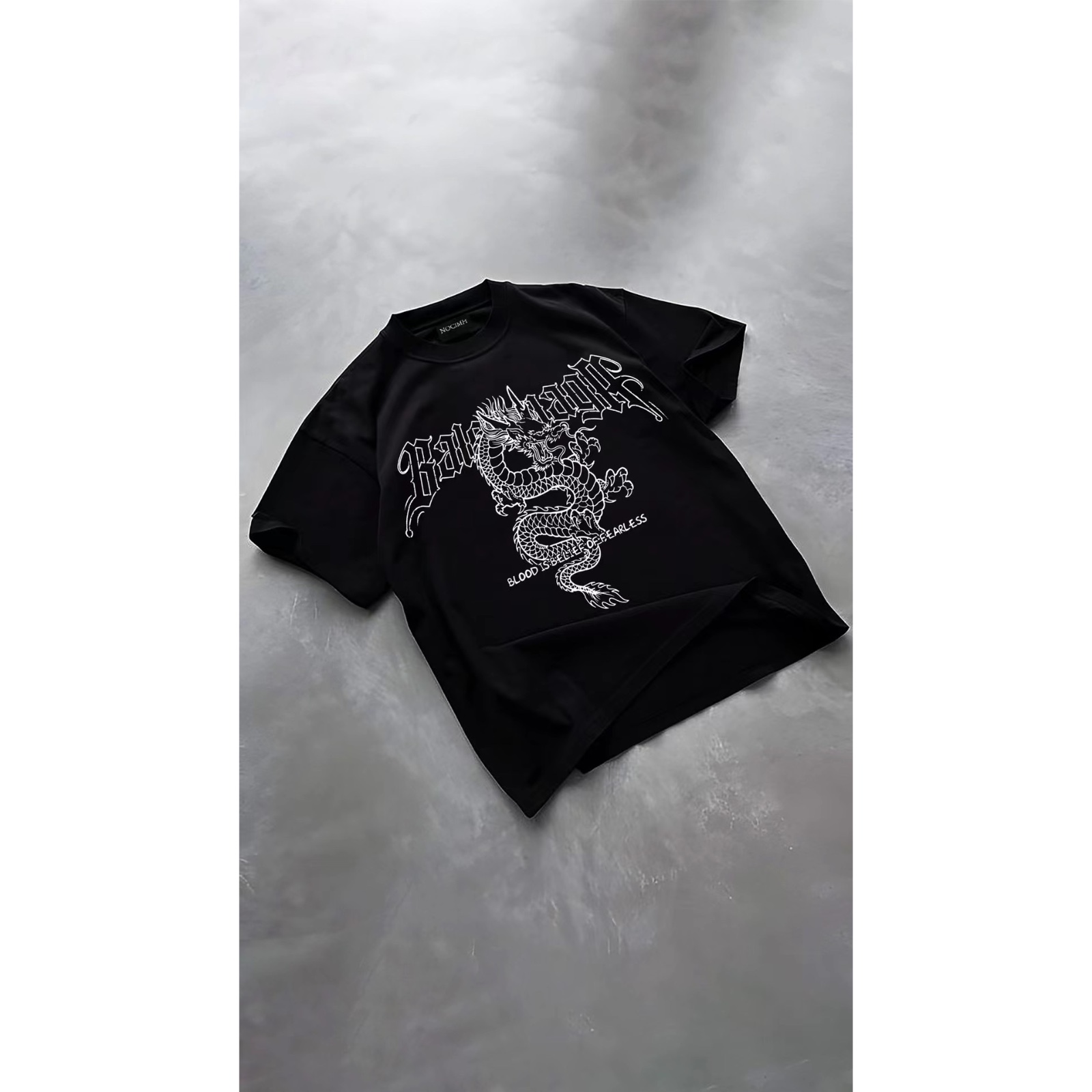 The NOCIMH Dragon Logo Tee merges Eastern myth with Western mockery. A hand-drawn dragon coils beneath a distorted gothic “Balenciaga” type, turning heritage iconography into subversive streetwear. With strong contrast and oversized proportions, this tee embodies ironic power with a cultural twist.