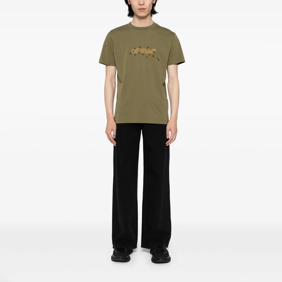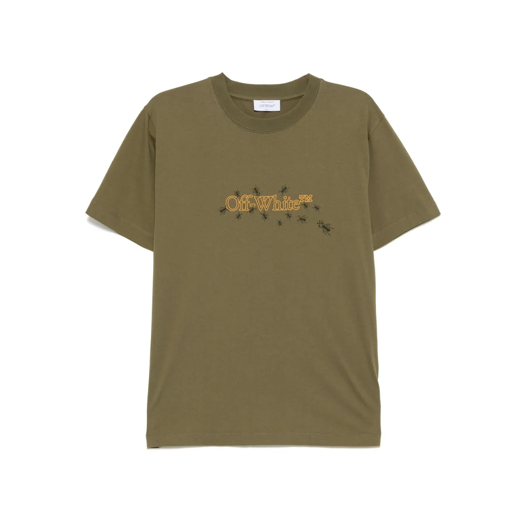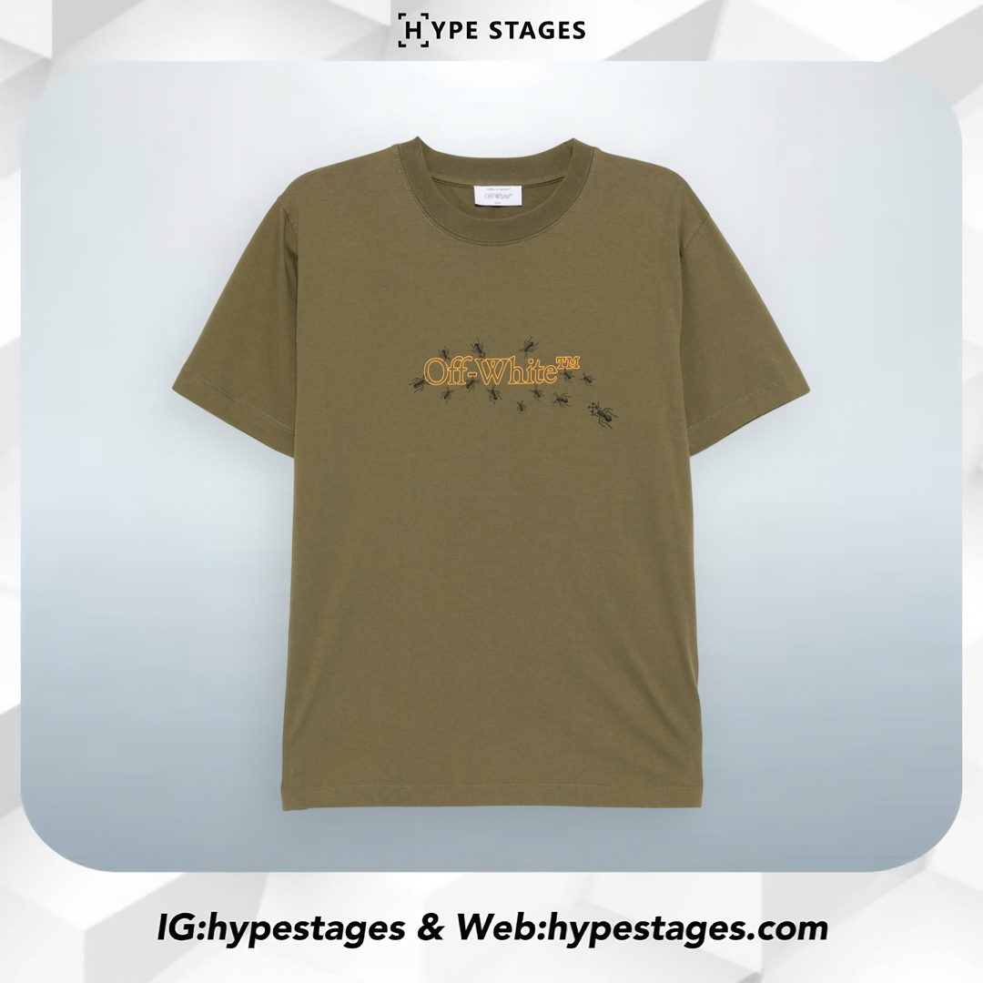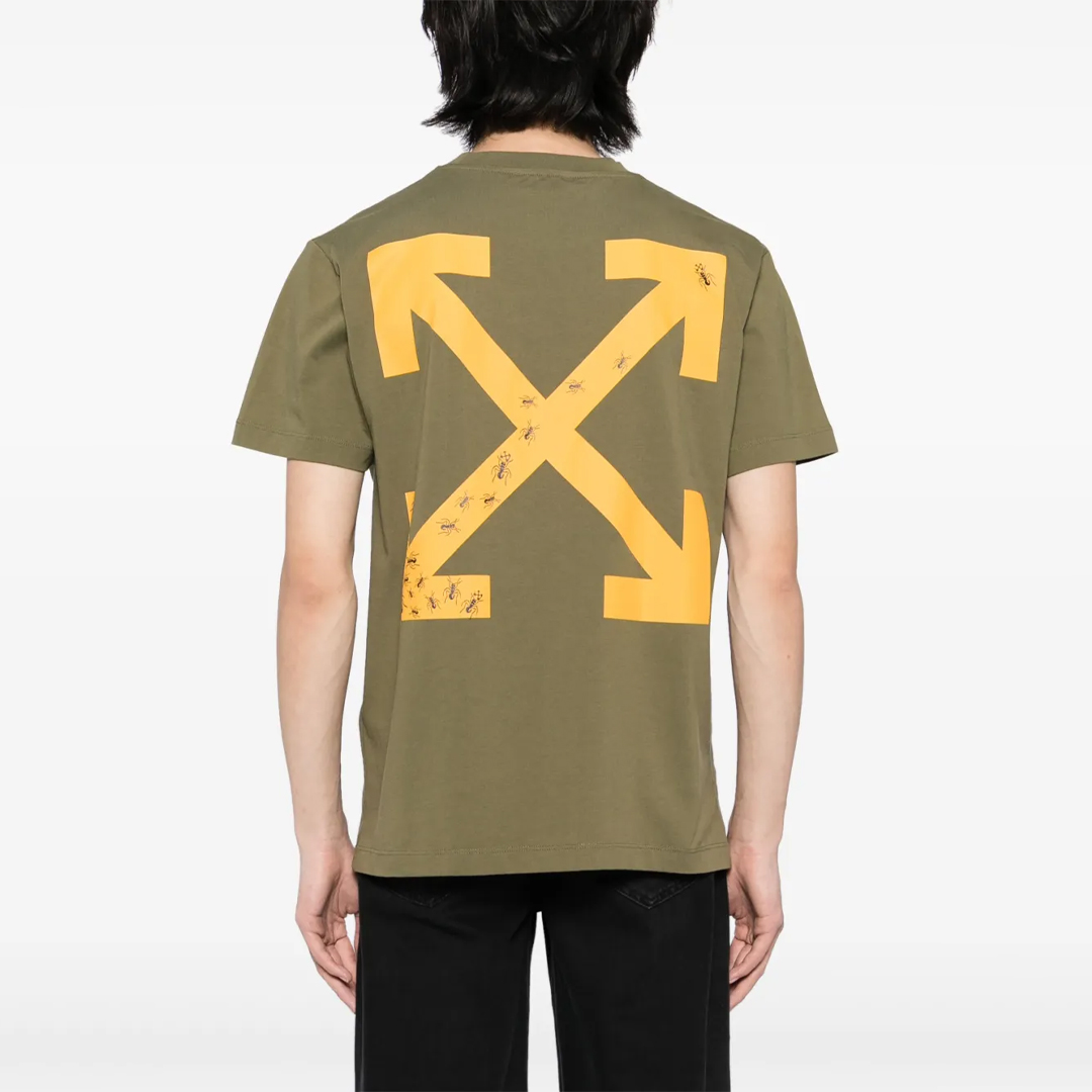 Make a statement with the OFF-WHITE Ants Arrow Tee, where bold streetwear meets artistic flair. Crafted from premium cotton, this tee features the iconic OFF-WHITE logo at the chest, surrounded by crawling ant graphics that continue onto the signature arrow motif on the back. The olive base adds a rugged tone, while the sharp yellow contrast injects an eye-catching pop — a perfect piece for urban explorers who value detail and originality.