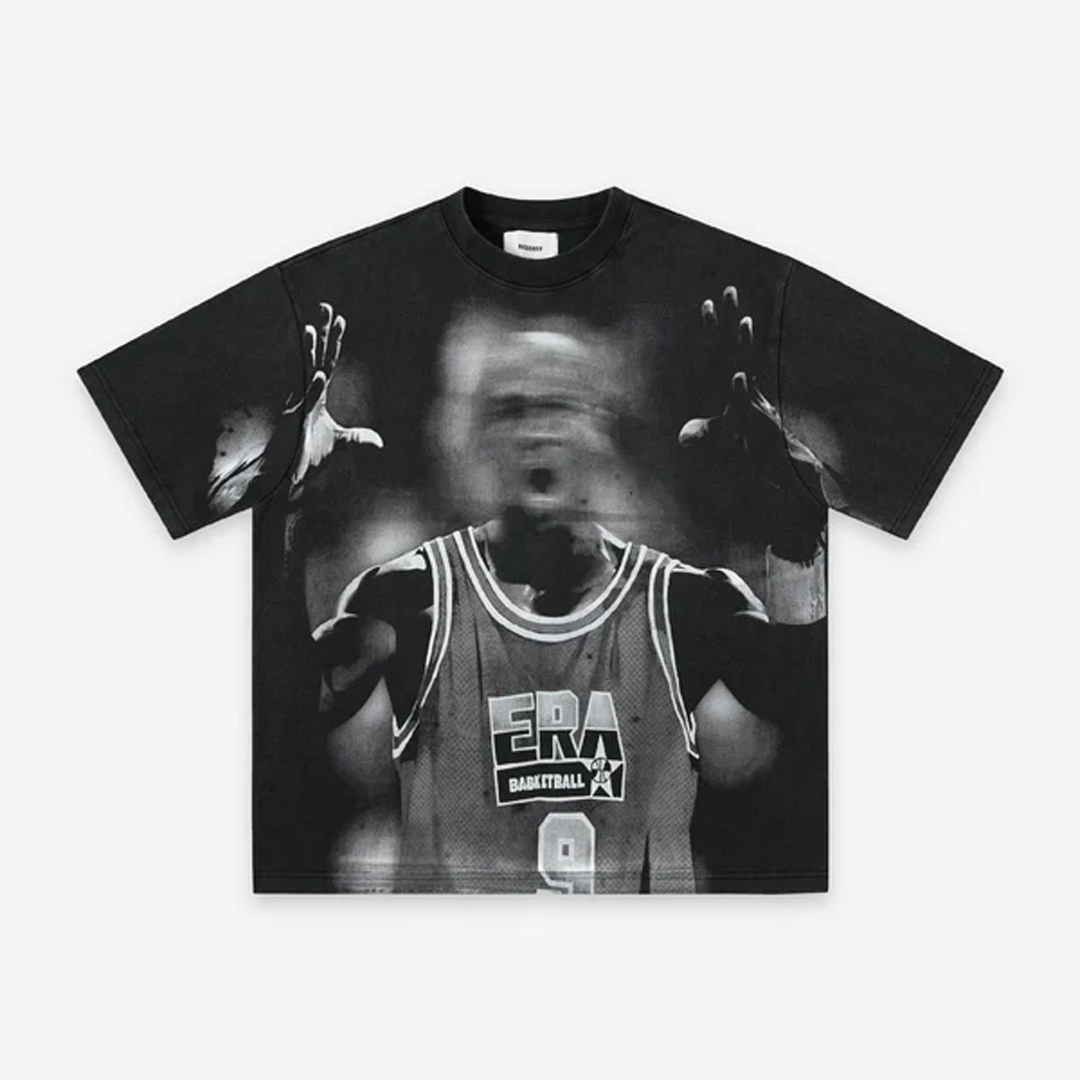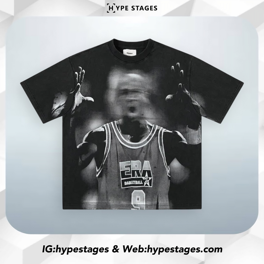 The RESERFF Monochrome Graphic Tee delivers visual punch with a distorted grayscale print of a vintage basketball moment. Designed in an oversized silhouette, the tee merges sports nostalgia and raw energy, capturing the motion and emotion of street culture in a single black-and-white frame.