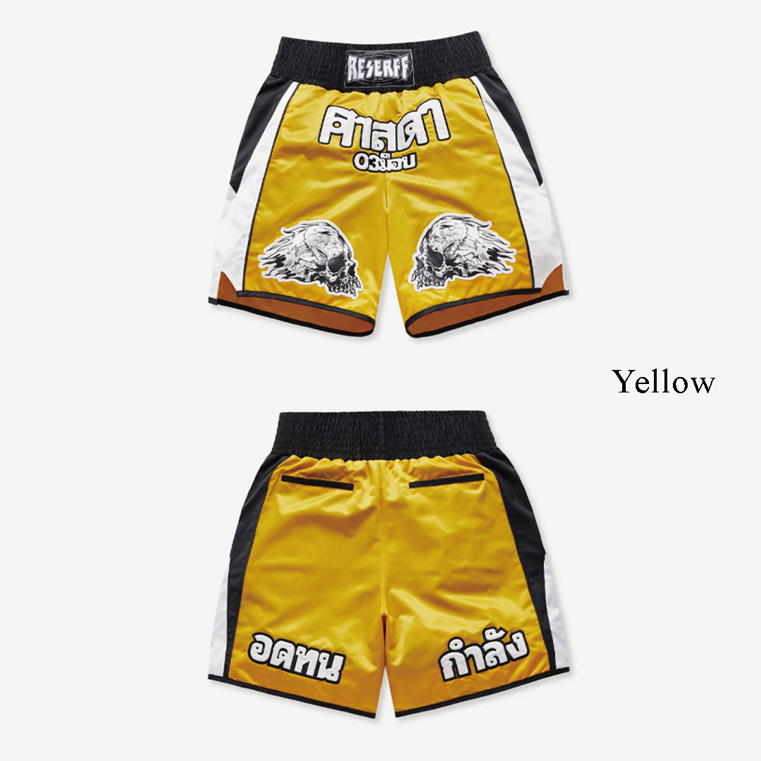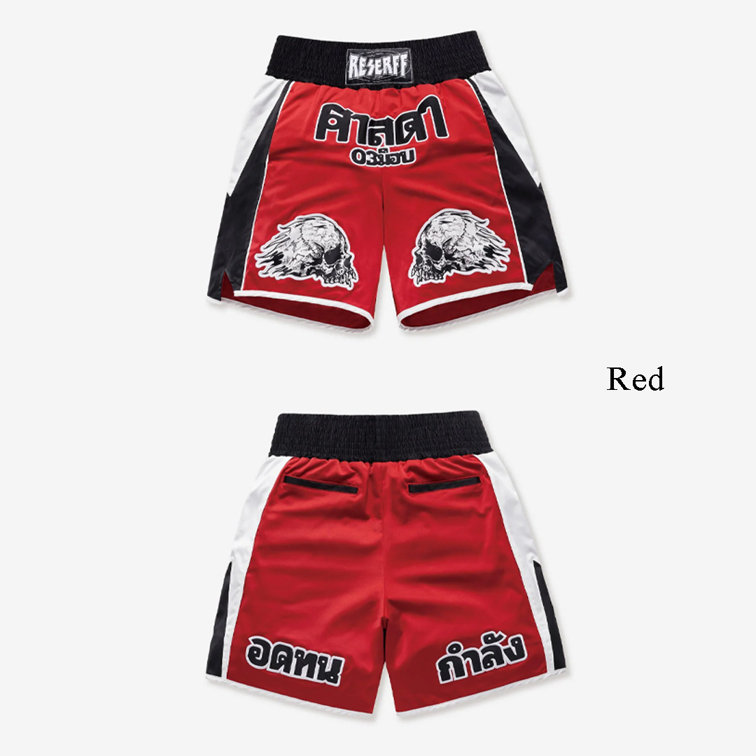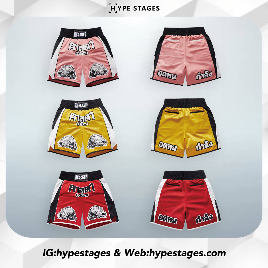 The RESERFF Skull Satin Boxing Shorts turn fightwear into fashion. Made from glossy satin-like polyester, these shorts feature bold skull illustrations on the front with Thai-inspired letter graphics on both legs. Finished with a thick waistband and Muay Thai silhouette, this piece brings a knockout punch of style to your streetwear rotation.