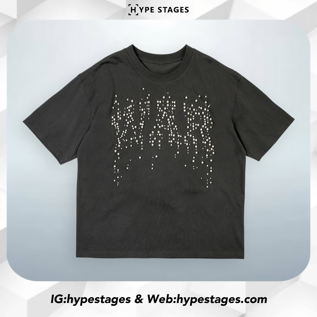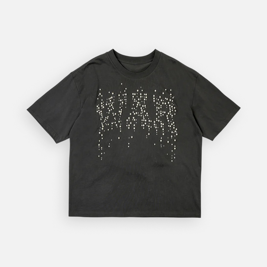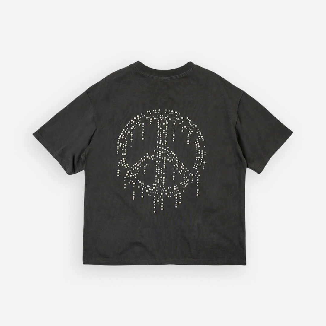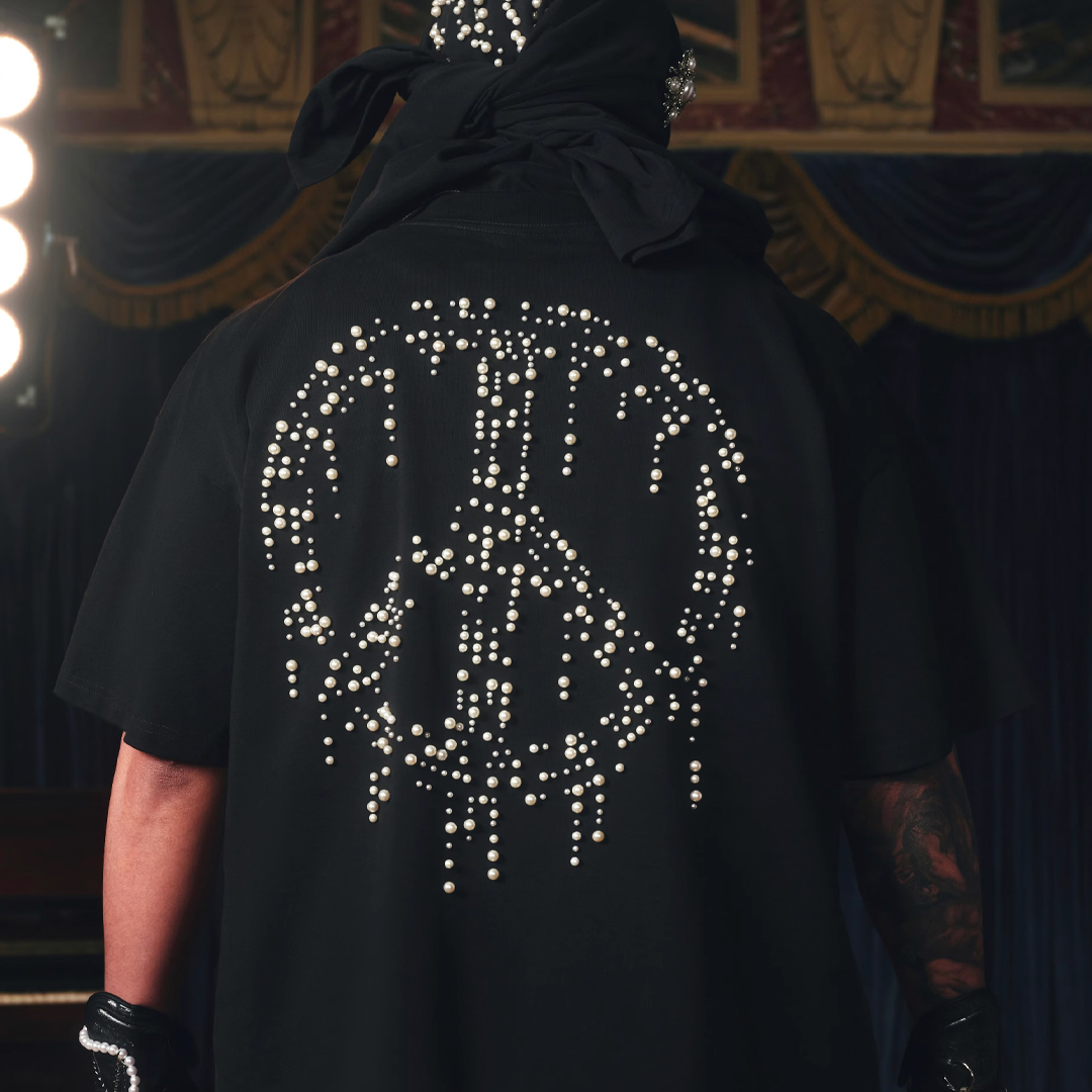 The RESERFF War Pearl Logo Tee fuses softness and rebellion — featuring simulated pearl drips forming military-inspired RESERFF typography on the front and a large peace symbol on the back. Crafted from heavyweight cotton, this tee transforms classic anti-war iconography into a bold streetwear message.