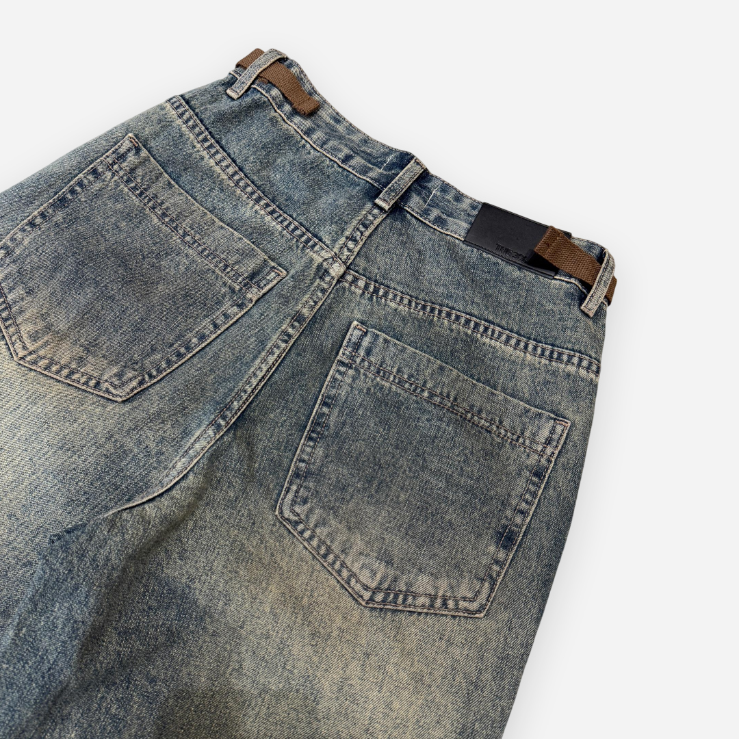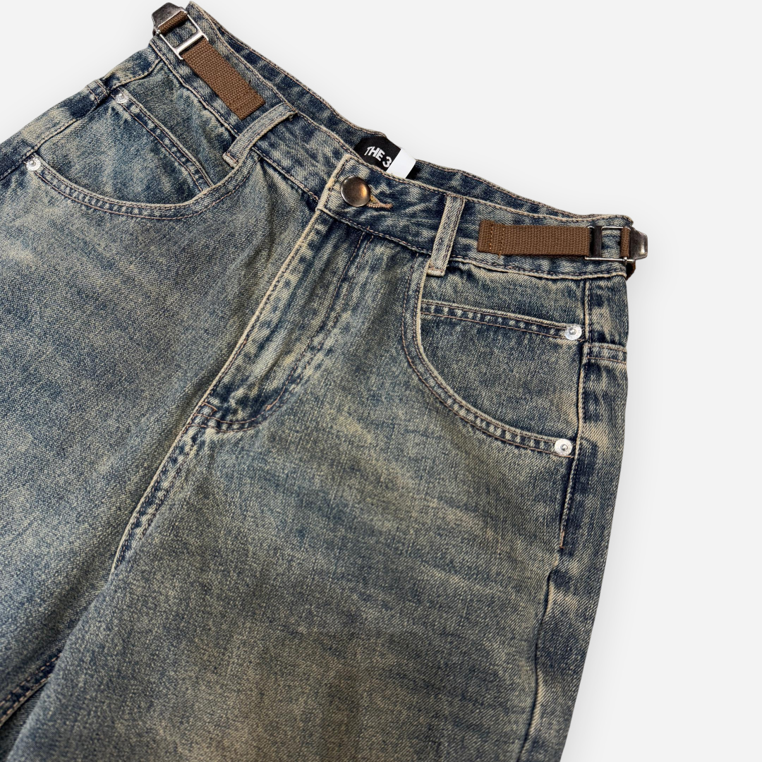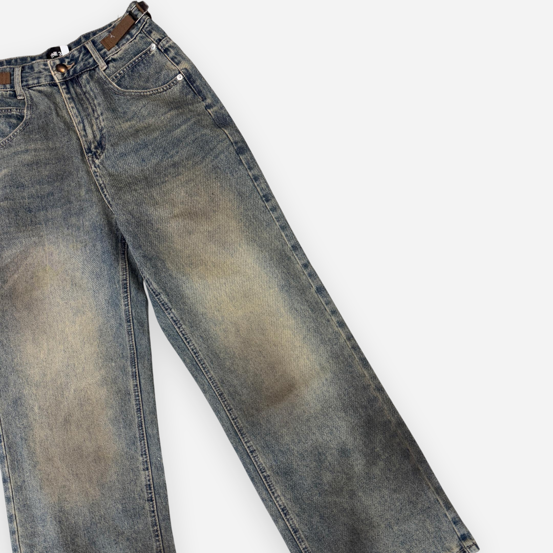 Crafted with vintage aesthetics and raw urban energy, THE 3% Buckle Distressed Jeans feature a washed finish with distinctive buckle accents on the waistband. The structured wide-leg silhouette adds a bold edge to any casual outfit, while the strategic fading throughout enhances its streetwear appeal. These jeans are perfect for those who embrace grunge-infused fashion with functional detail.