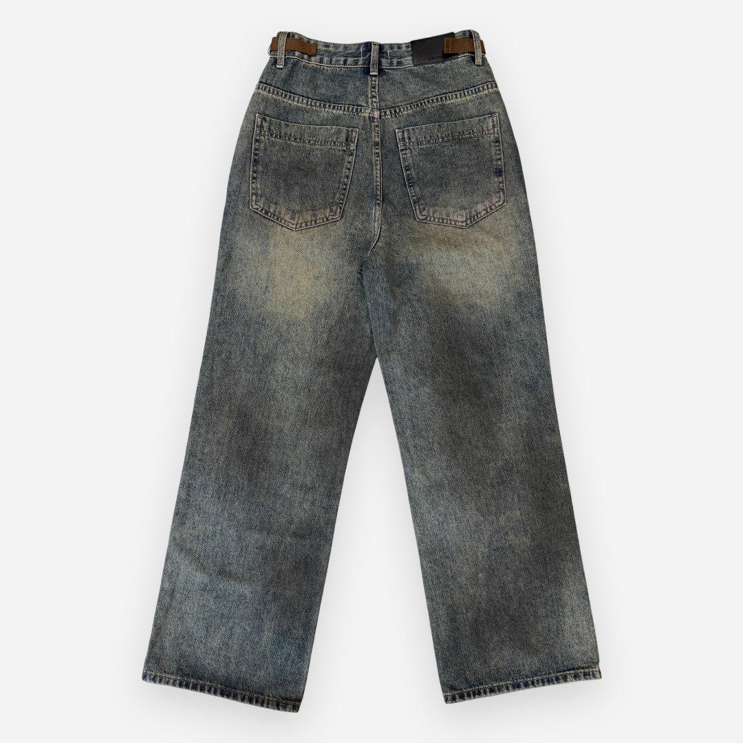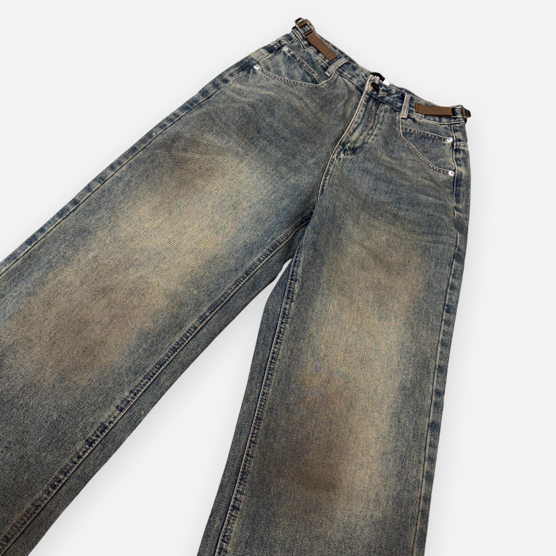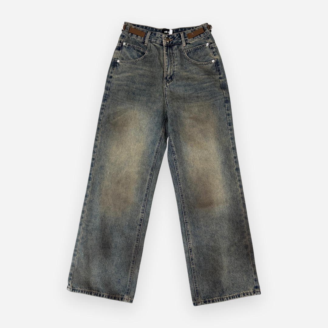 Crafted with vintage aesthetics and raw urban energy, THE 3% Buckle Distressed Jeans feature a washed finish with distinctive buckle accents on the waistband. The structured wide-leg silhouette adds a bold edge to any casual outfit, while the strategic fading throughout enhances its streetwear appeal. These jeans are perfect for those who embrace grunge-infused fashion with functional detail.