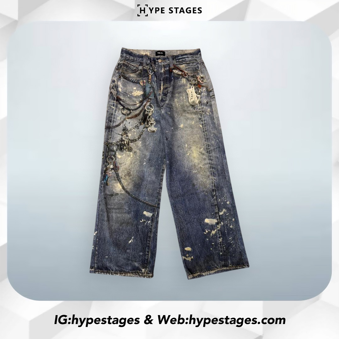 The THE 3% Metal Chain Paint Graphic Jeans bring street-ready character to everyday denim with bold paint graphic accents and attached metal chain detailing for standout visual appeal. Designed in a relaxed silhouette and sturdy denim construction, these jeans combine comfortable wear with expressive edge — ideal for pairing with tees and hoodies to elevate casual outfits.