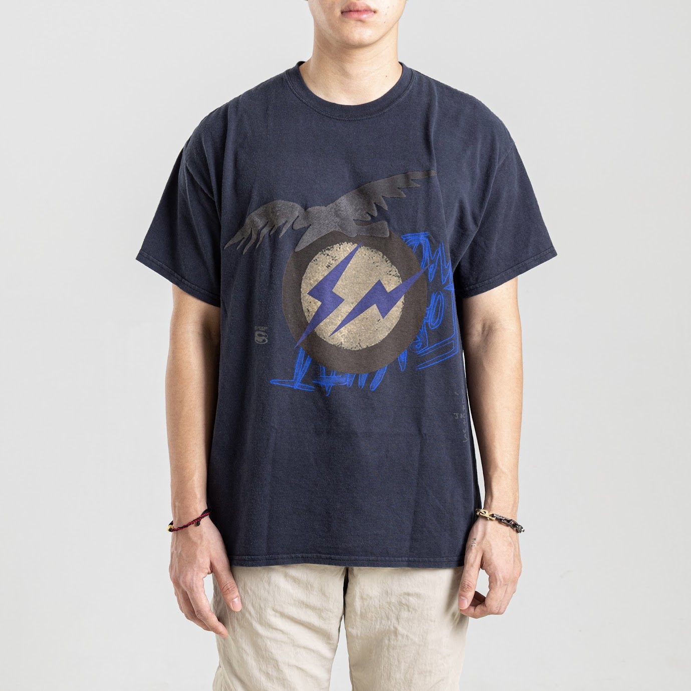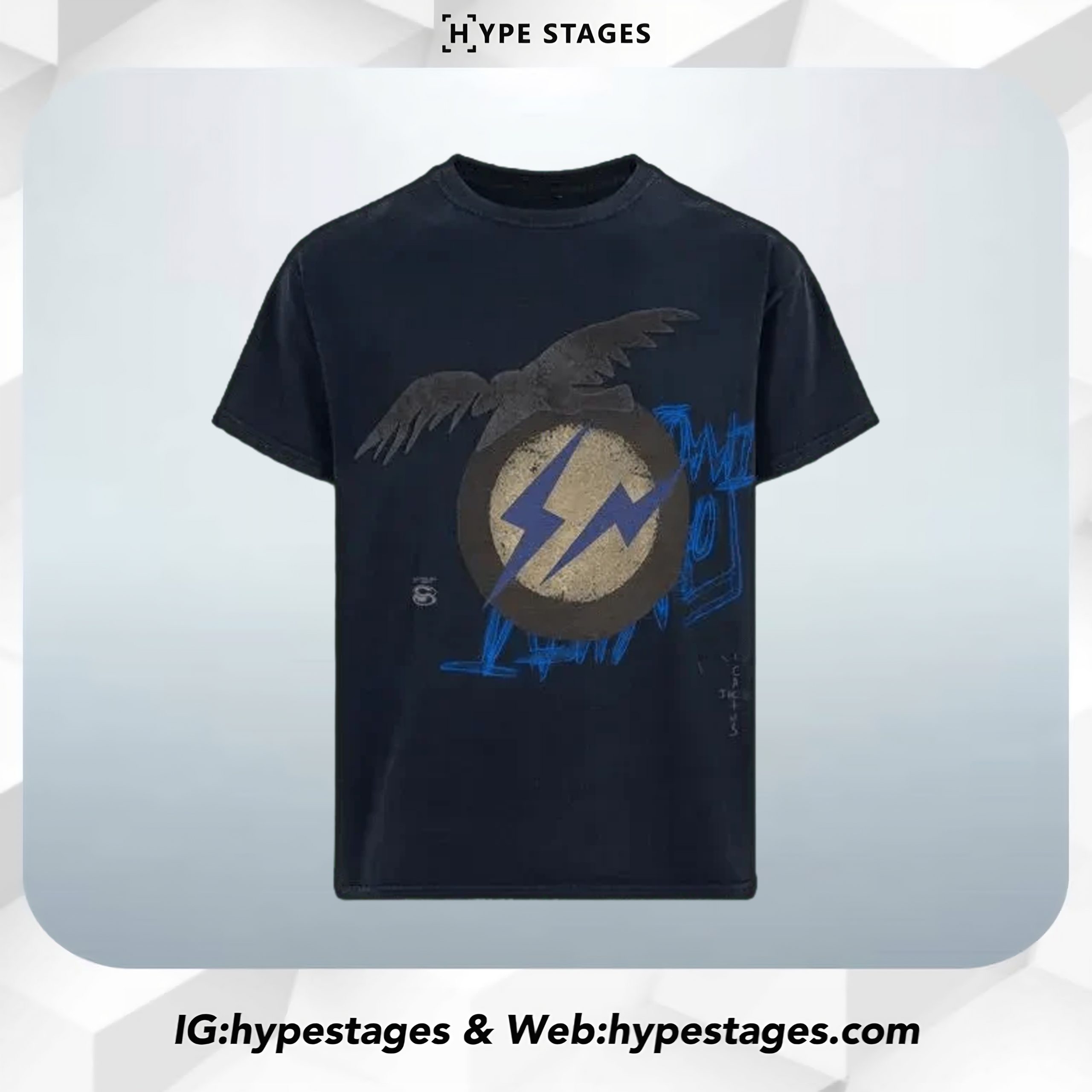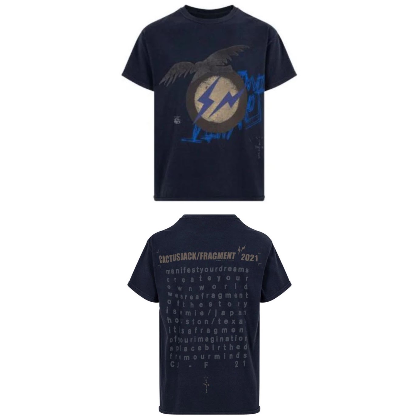 The Travis Scott x Fragment Create Vintage Washed Tee channels rebellious energy through aged aesthetics and cryptic symbolism. With a distressed navy base, it features the Fragment lightning bolt emblem overlaid by an eagle motif, conveying power and resistance. Typography across the back completes this statement piece, blending military grit with street-style edge.