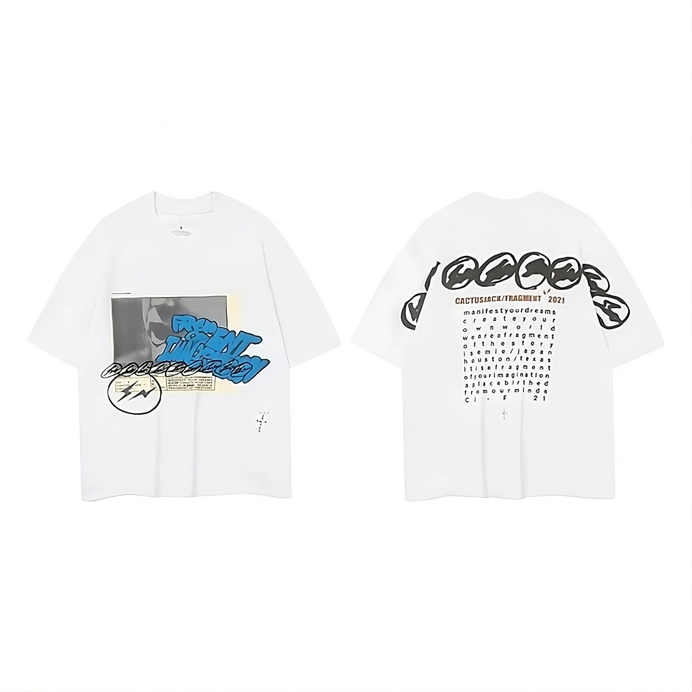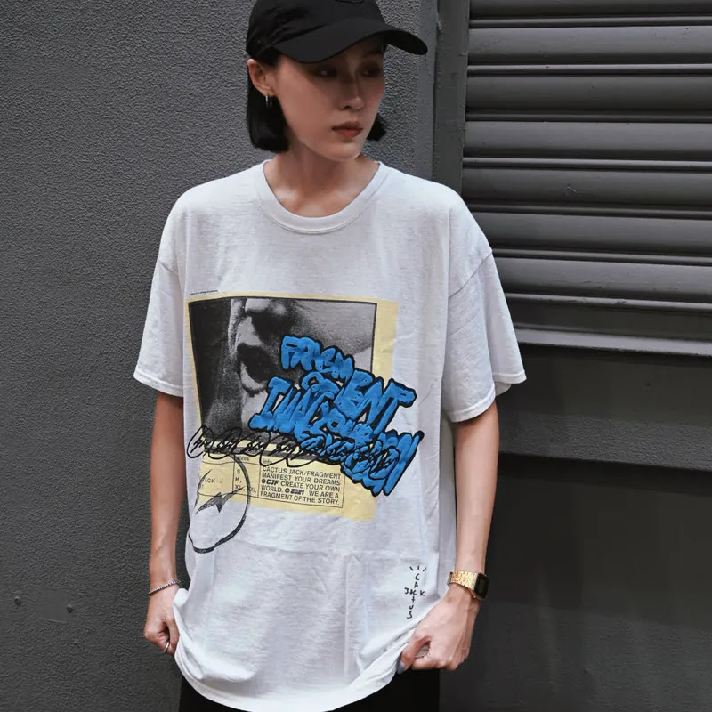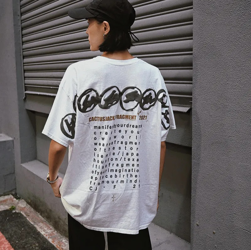 The Travis Scott x Fragment Manifest Cream Tee blends raw photographic collage and signature graphics into a conceptual streetwear staple. The oversized print on the front channels Travis’s artistic chaos, while Fragment’s encoded design wraps around the back—making this tee a canvas of controlled disorder.