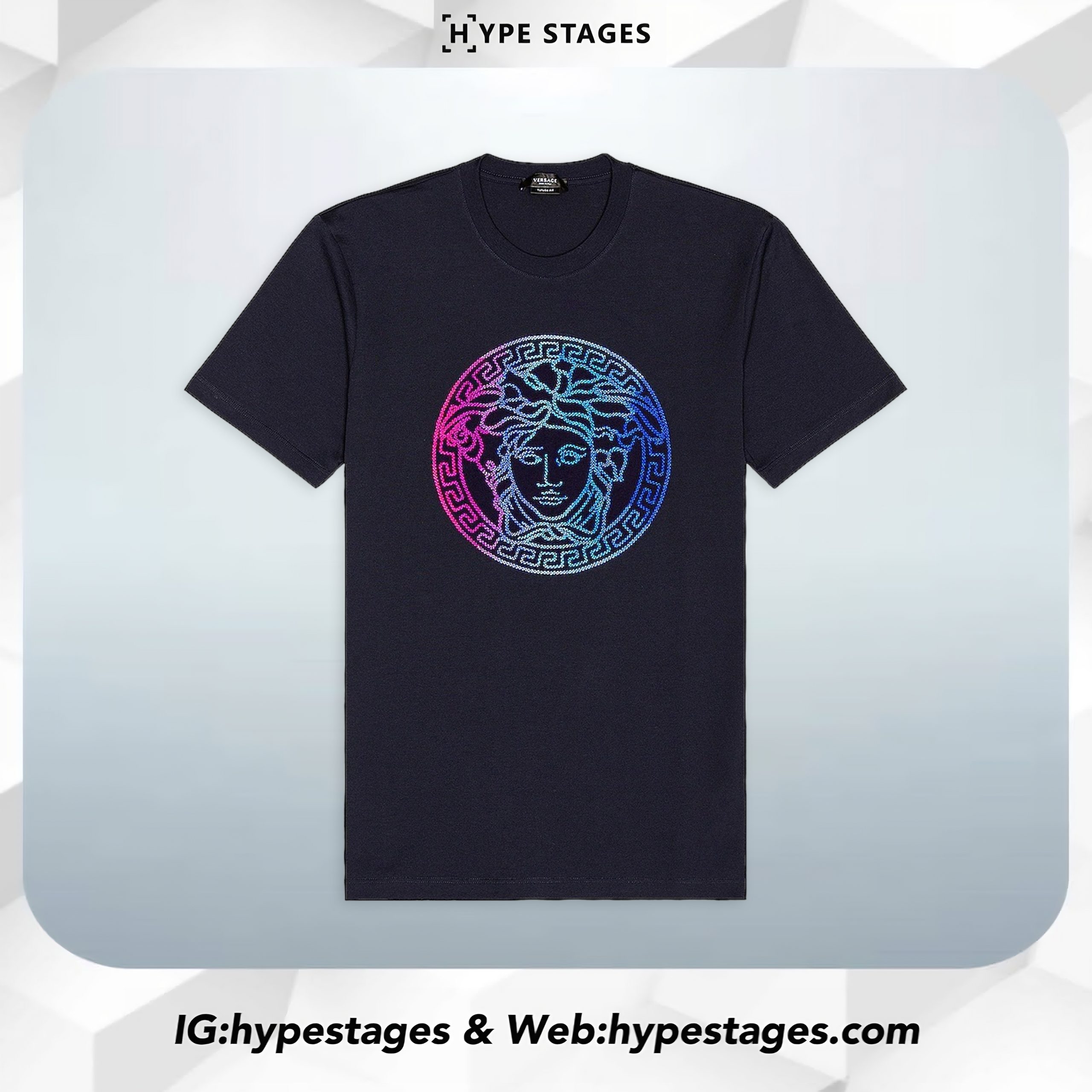 The Versace Navy Embroidery Medusa Tee merges iconic luxury with bold craftsmanship. Crafted from premium cotton, this navy tee showcases a striking multicolor embroidered Medusa head at the chest — a timeless emblem of Versace’s mythological identity and bold fashion statement.